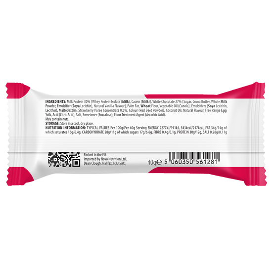 Novo Strawberries & Cream Wafers, have a delicious cream filling and crispy wafer, all smothered in irresistible real Belgian chocolate. With a generous 12g of Protein per bar, healthier snacking has never been so tasty!