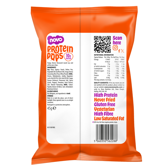 Novo Protein Pops are a new protein chip, available in 4 irresistible flavours, that’s deeply satisfying, but never deep fried. They’re a delicious high protein pop chip, with 10g of protein per bag, making them a great way to add more protein to your diet.